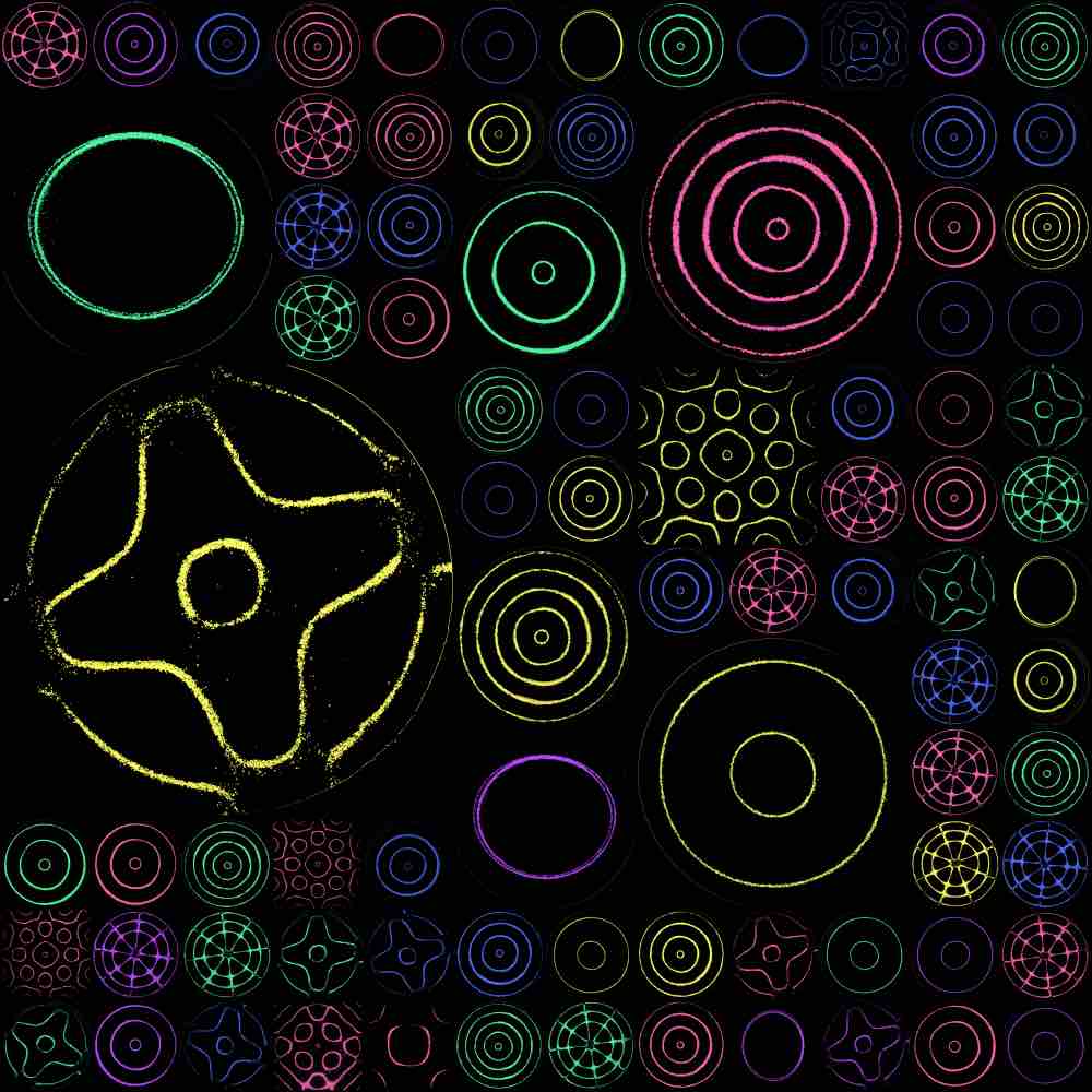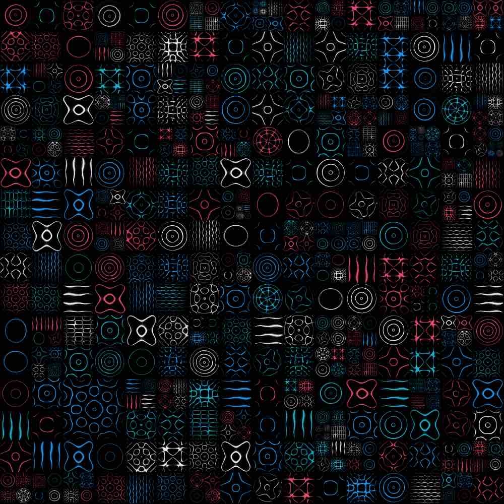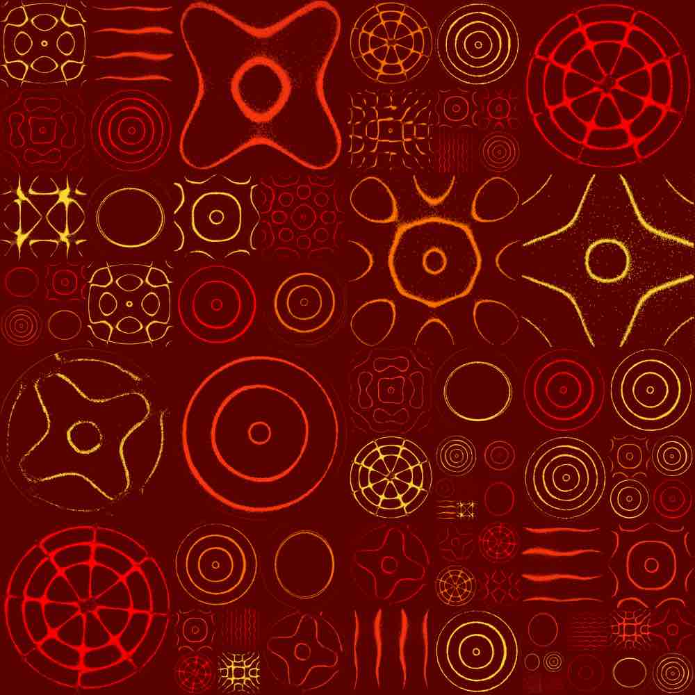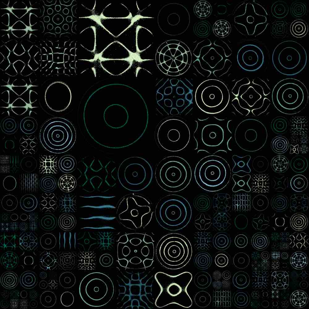 The random grid algorithm first selects m to dictate the mxm grid size, where 1 ≤ m ≤ 25. Then, as the grid is traversed, the number of grid spaces that a single Chladni plate covers is allocated via a pseudorandom generator, bounded by the mxm grid size or any existing plates already placed on the grid. Here are some examples of the random grid output: