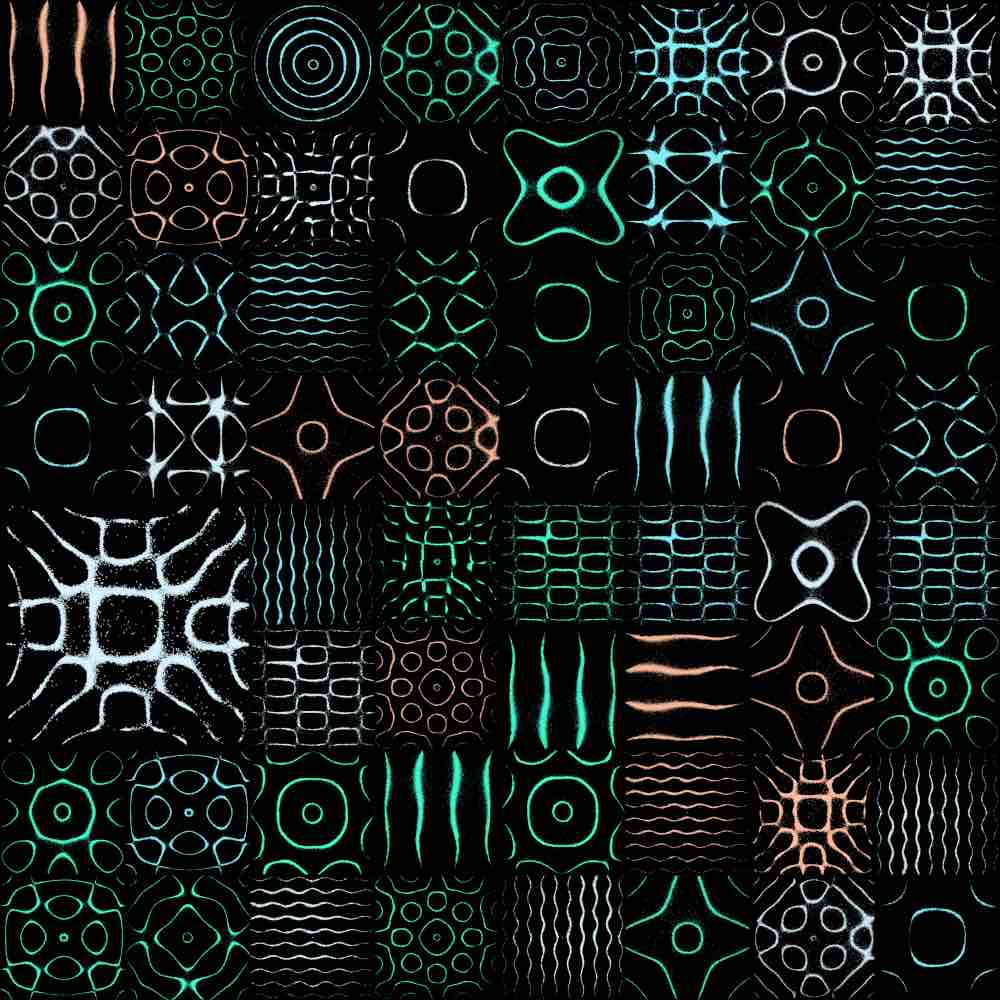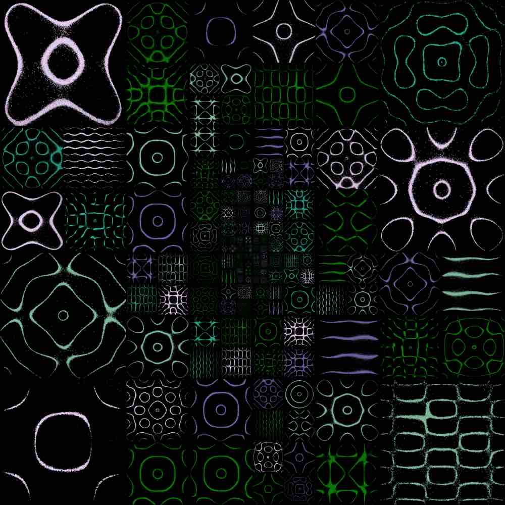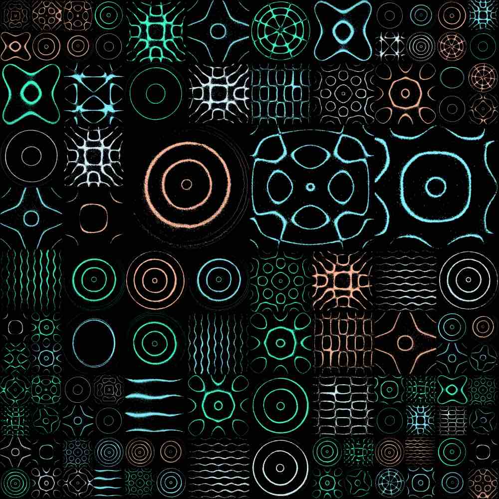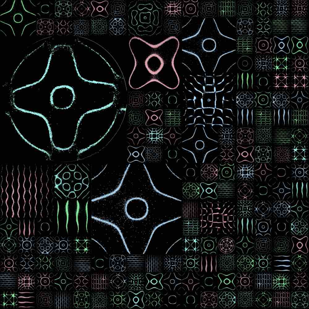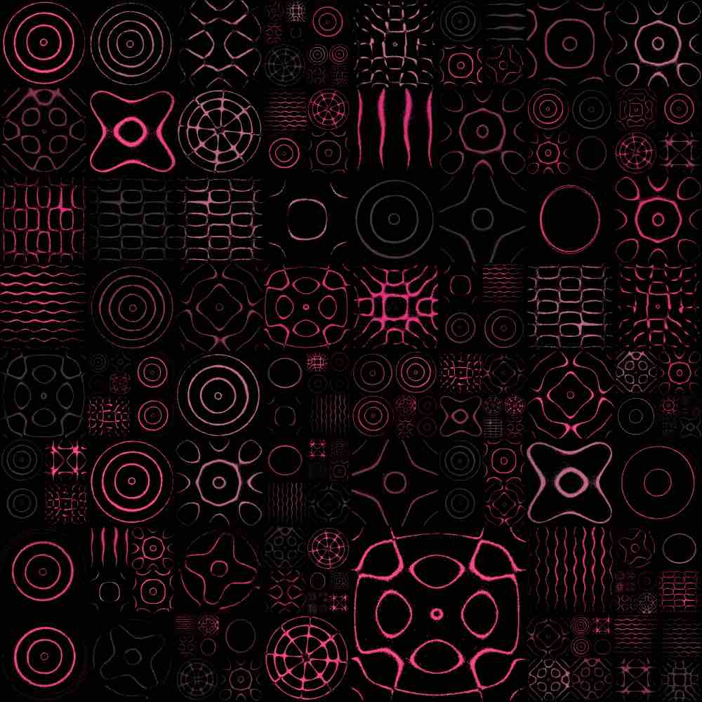 The random grid algorithm first selects m to dictate the mxm grid size, where 1 ≤ m ≤ 25. Then, as the grid is traversed, the number of grid spaces that a single Chladni plate covers is allocated via a pseudorandom generator, bounded by the mxm grid size or any existing plates already placed on the grid. Here are some examples of the random grid output: