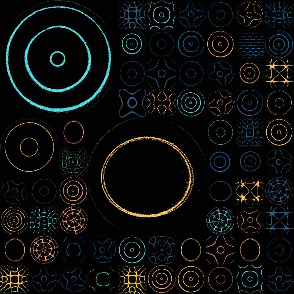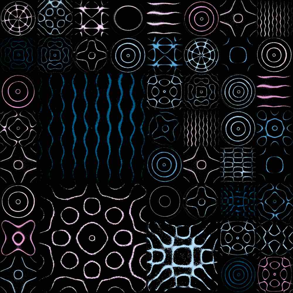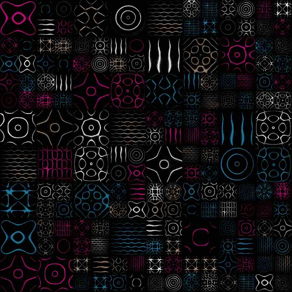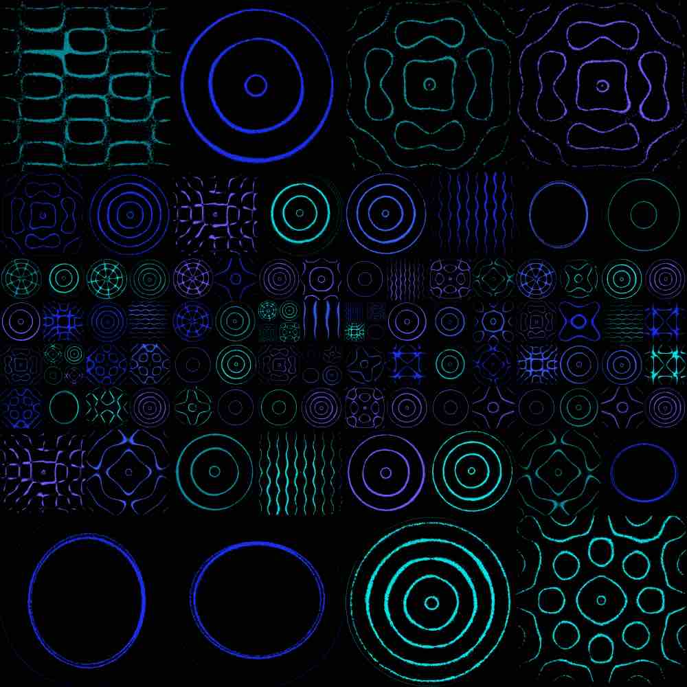 The random grid algorithm first selects m to dictate the mxm grid size, where 1 ≤ m ≤ 25. Then, as the grid is traversed, the number of grid spaces that a single Chladni plate covers is allocated via a pseudorandom generator, bounded by the mxm grid size or any existing plates already placed on the grid. Here are some examples of the random grid output: