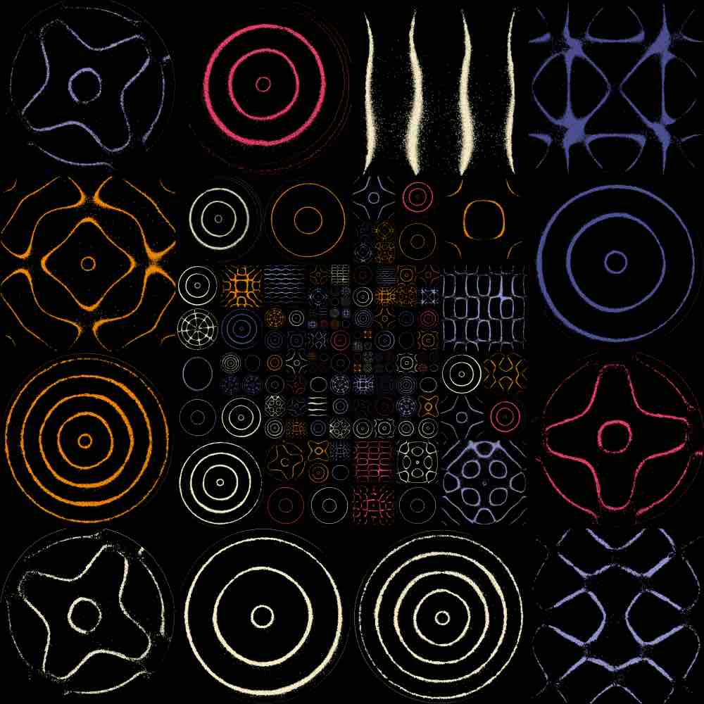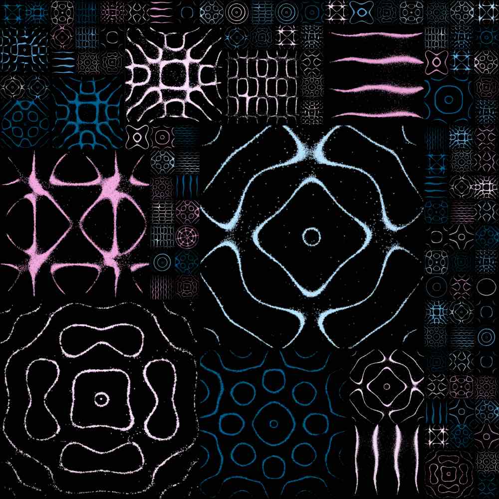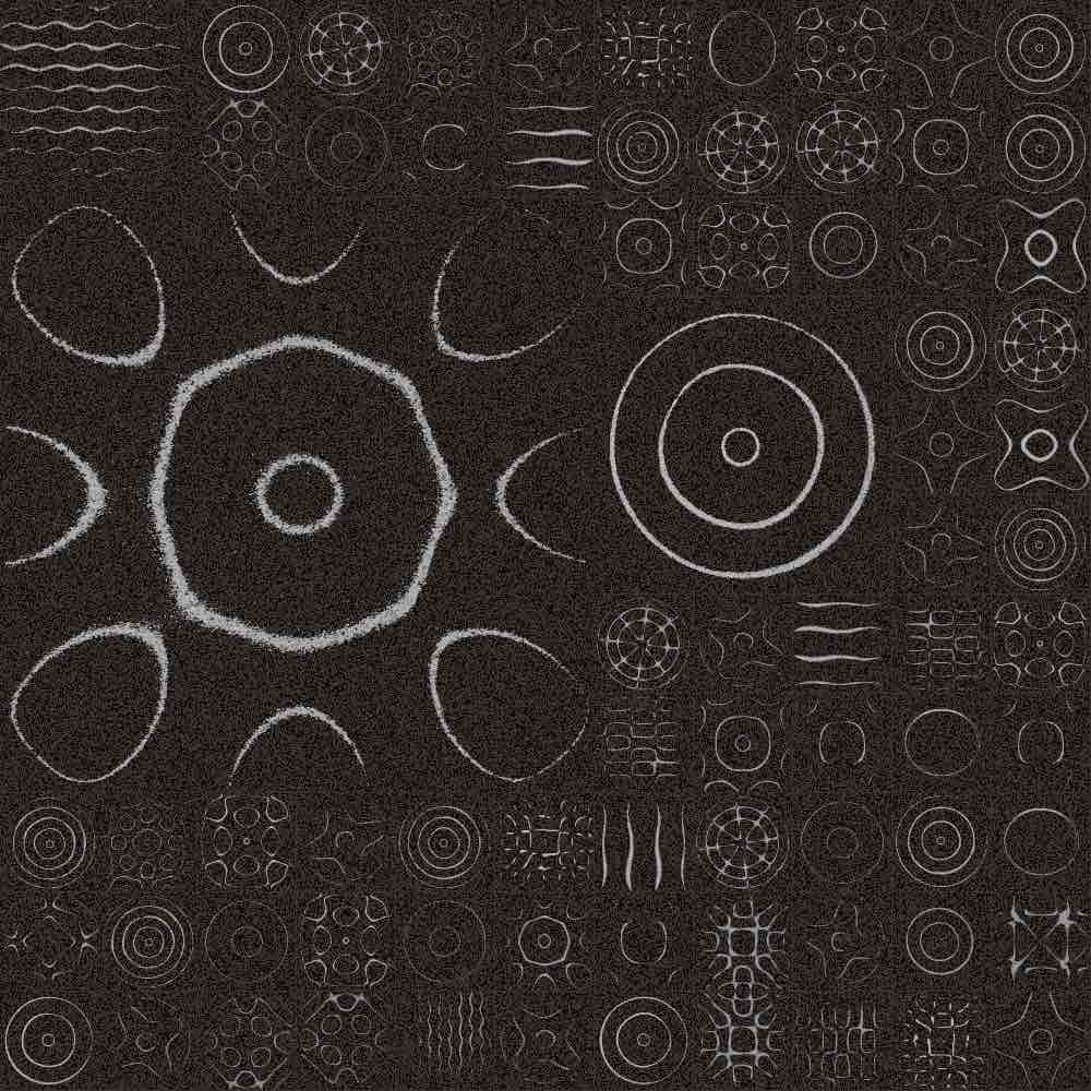 Each plate in an Arabesque is a real metal plate, with real sand, photographed while in vibration. In some plates, the grains of sand are still visible. The captured image of the plate undergoes OpenCV transformation, using filters and color manipulation to produce a refined black square containing sand. An example of the original and transformed image are shown below.