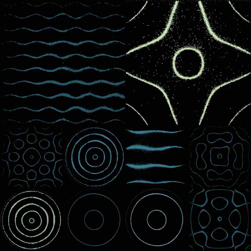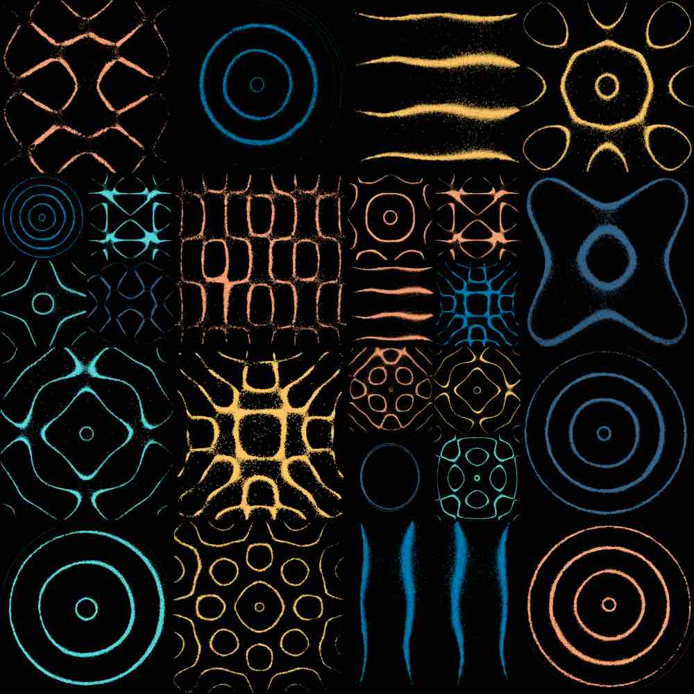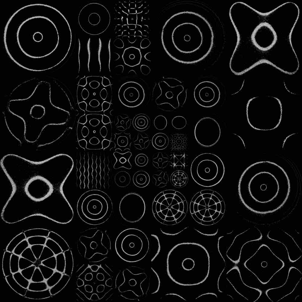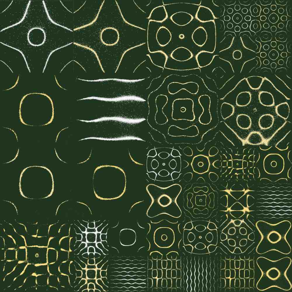 Patterns emerge in sand on a metal plate vibrating at resonant frequencies. These exquisite patterns are a result of resonant modes created by standing acoustic waves on the metal plates. In other words, when the plate vibrates at just the right frequency, there are certain areas of the plate that actually “stand still”, collecting the tiny bits of sand originally sprinkled onto the plate.
